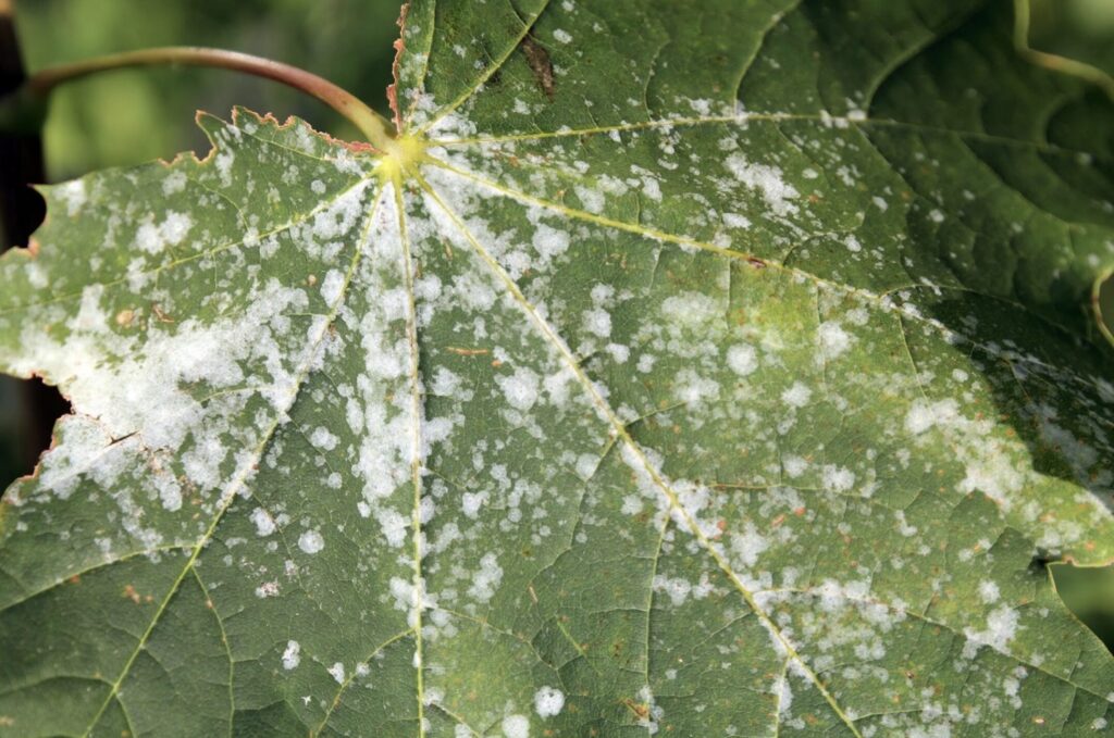 El oídio es un hongo que se presenta como manchas blancas en polvo sobre las hojas. Puede propagarse rápidamente y destruir cosechas completas.